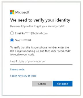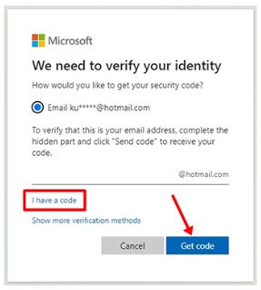 3. เลือกอีเมลสำรองที่เราเคยผูกไว้ จากนั้นกรอกชื่ออีเมลนั้นเต็ม ๆ แล้วคลิกปุ่ม Get code โดยระบบจะส่งโค้ดไปที่อีเมลนั้น เมื่อได้รับโค้ดแล้วให้คลิกที่ I have a code