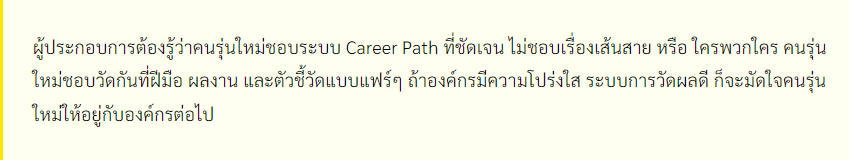 อย่างไรก็ตาม เด็กจบใหม่มักมองเรื่องคุณค่าในงานมาก และชอบหาโอกาสใหม่ๆ ที่ดีกว่าอยู่เสมอ ดังนั้นหากมีอะไรไม่ดี คนรุ่นใหม่จะไหลออกจากองค์กรทันที องค์กรที่ต้องการคนรุ่นใหม่เป็นพลังขับเคลื่อนพัฒนาต้องมีการปรับรูปแบบการบริหารงานเพื่อดึงดูดใจเขาให้ได้