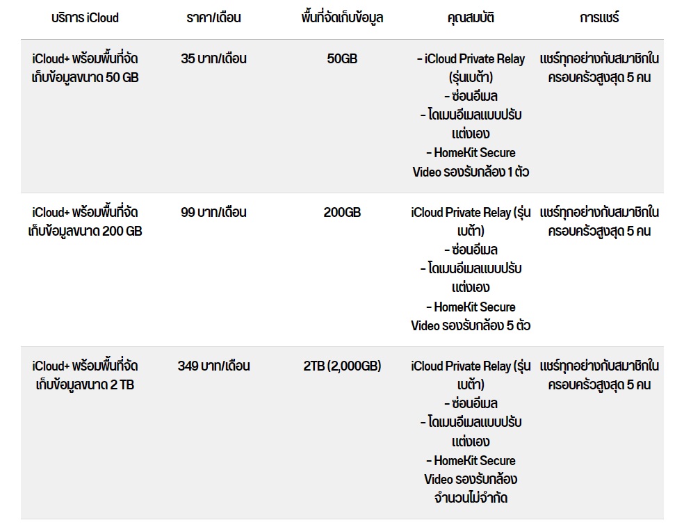 ก่อนอื่นเราก็ต้องมาดูกันก่อนว่า ความจุของ iCloud นั้นมีอะไรบ้าง อย่างที่กล่าวไปข้างต้นว่า iCloud นั้น เป็นพื้นที่สำหรับจัดเก็บข้อมูล ไม่ว่าจะเป็น ไฟล์, รูปภาพ, เอกสาร, รหัสผ่าน หรือข้อมูลอื่นๆ บนระบบคลาวด์ ครอบคลุมไปถึงการอัพเดตอุปกรณ์ต่างๆ ของผู้ที่ใช้งานผลิตภัณฑ์ Apple และการแชร์ข้อมูลระหว่างกันด้วย โดยเริ่มต้นนั้น iCloud มาพร้อมกับบัญชีอีเมล และพื้นที่จัดเก็บข้อมูลฟรี 5GB โดยผู้ใช้งานสามารถซื้อบริการ iCloud+ เพื่อเพิ่มพื้นที่สำหรับจัดเก็บข้อมูล รวมไปถึงคุณสมบัติอื่นๆ เพิ่มเติมได้